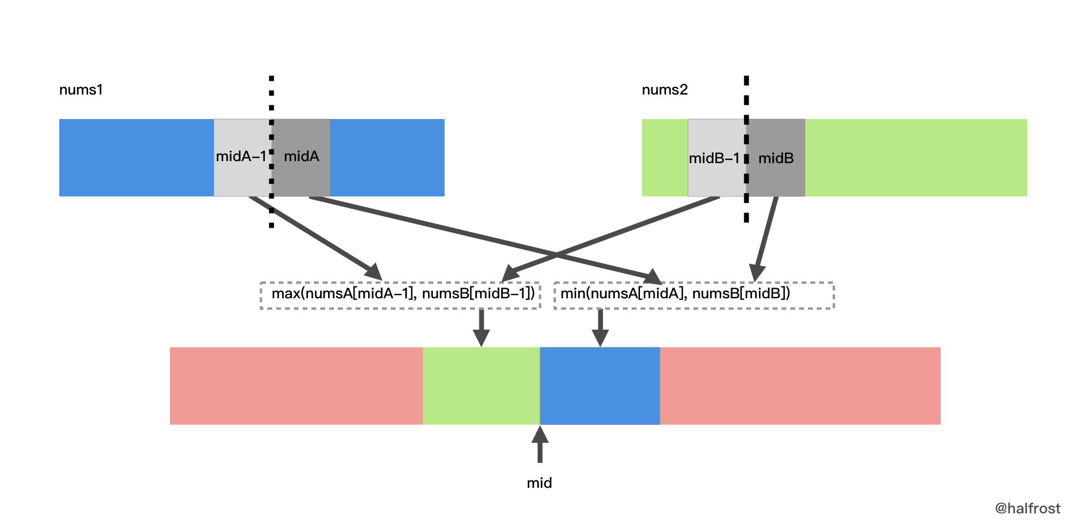 O(m+n)的,不符合题意。看到题目给的log的时间复杂度,很容易联想到二分搜索。由于要找到最终合并以后数组的中位数,两个数组的总大小也知道,所以中间这个位置也是知道的。只需要二分搜索一个数组中切分的位置,另一个数组中切分的位置也能得到。为了使得时间复杂度最小,所以二分搜索两个数组中长度较小的那个数组。